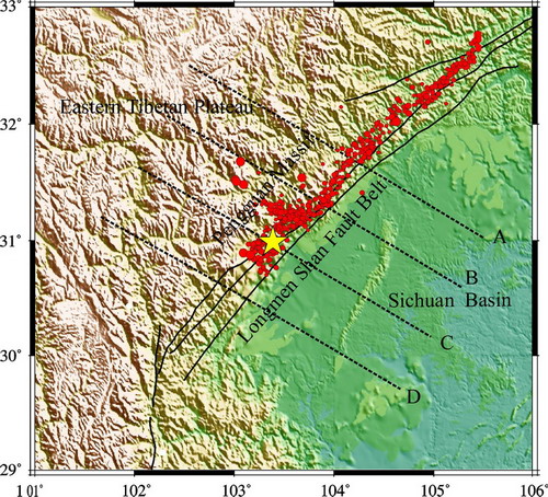 图1:龙门山断裂带的构造示意图与汶川八级地震的震中位置(黄色星)以及随后的余震(红色圆圈)。黑色的实线是主要的断裂,虚线是四个纵剖面的位置   图2:龙门山断裂带的S波速度剖面,它们的位置显示在图1中,白色的圆圈是重新定位的震源   2008年5月12日四川汶川发生...