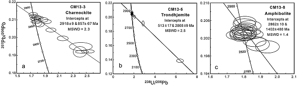 图1 刚果克拉通Ntem杂岩中紫苏花岗岩、奥长花岗岩和斜长角闪岩的SIMS锆石U-Pb谐和图