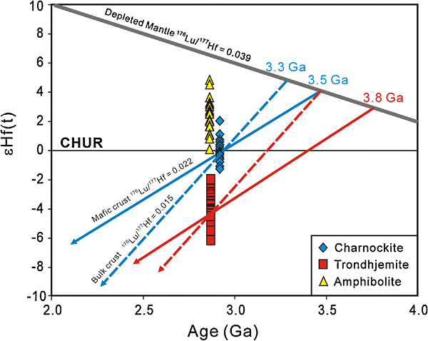 图3 刚果克拉通Ntem杂岩中紫苏花岗岩、奥长花岗岩和斜长角闪岩的Age-eHf(T)图解