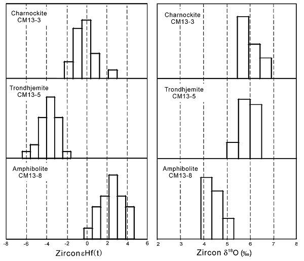 图2刚果克拉通Ntem杂岩中紫苏花岗岩、奥长花岗岩和斜长角闪岩的Hf-O同位素