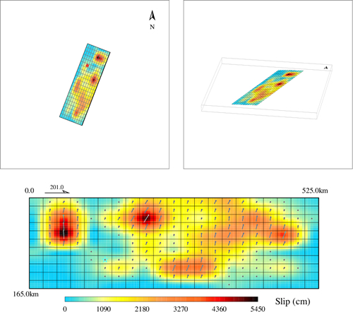 计算得到的地震矩为3.6×10**22Nm,Mw=9.0。最大滑动5450cm。