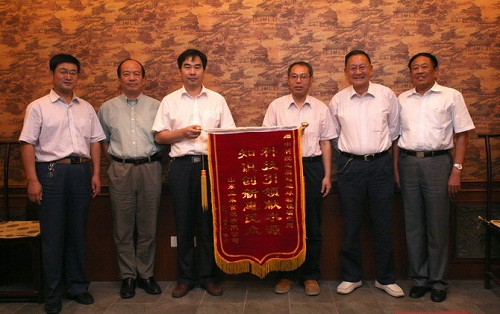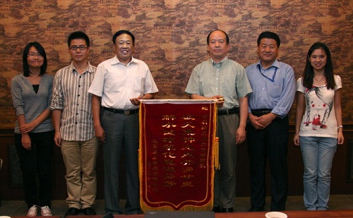 2012年9月14日,山东省淄博市博山区区委常委兼宣传部长高健及山东珑山集团董事长岳来禧一行四人专程来到北京,向我所及庞忠和教授找水团队赠送两面锦旗,感谢我所科研人员解决了当地花岗岩分布区找水难题。我所汪集暘院士、党委副书记钟华等参加了博山找水成果介绍会与赠旗仪式。