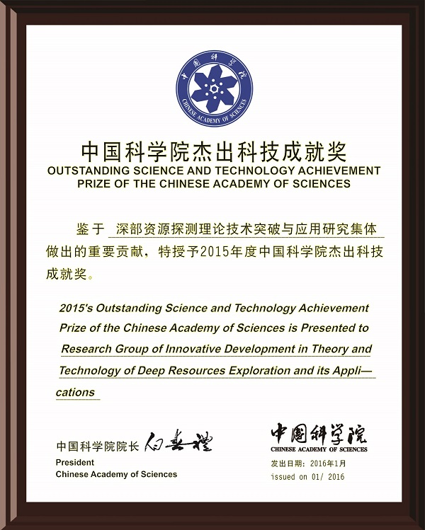 2016年1月14日上午,2015年度中国科学院杰出科技成就奖颁奖仪式在中国科学院大学国际会议中心举行。我所底青云研究员、电子学所方广有研究员、我所薛国强研究员作为突出贡献者领衔的“深部资源探测理论技术突破与应用研究集体”荣获2015年度中国科学院杰出科技成就奖。中国科学院院长、党组书记白春礼院士为研究集体获奖代表底青云研究员颁奖。这是我所继“华北克拉通破坏研究集体”荣获2014年度中国科学院杰出科技成就奖后,再次获得该奖励。