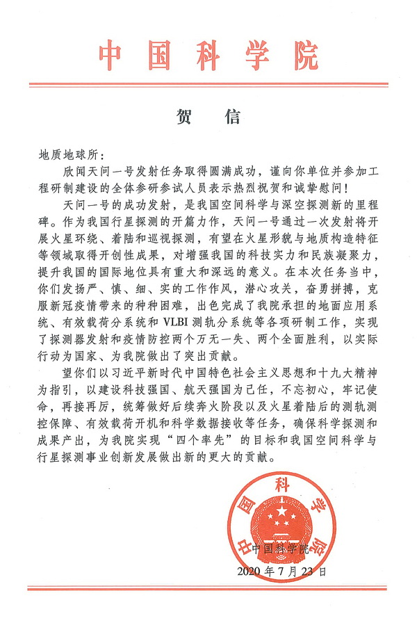 热烈祝贺“天问一号”探测器发射成功!我所广大科技工作者为此作出了重要贡献,中国科学院发来贺信!
