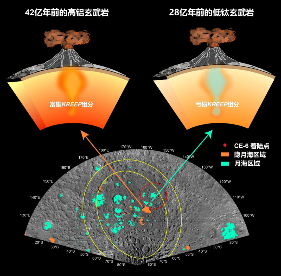 月球正面和背面火山岩的分布差异极大,是月球二分性的重要体现。月球二分性是指月球正面和背面在形貌、成分、月壳厚度、岩浆活动多少等方面存在的显著差异。嫦娥六号(CE-6)任务首次实现月球背面采样返回,为人类研究月球背面火山活动提供了独有的素材。