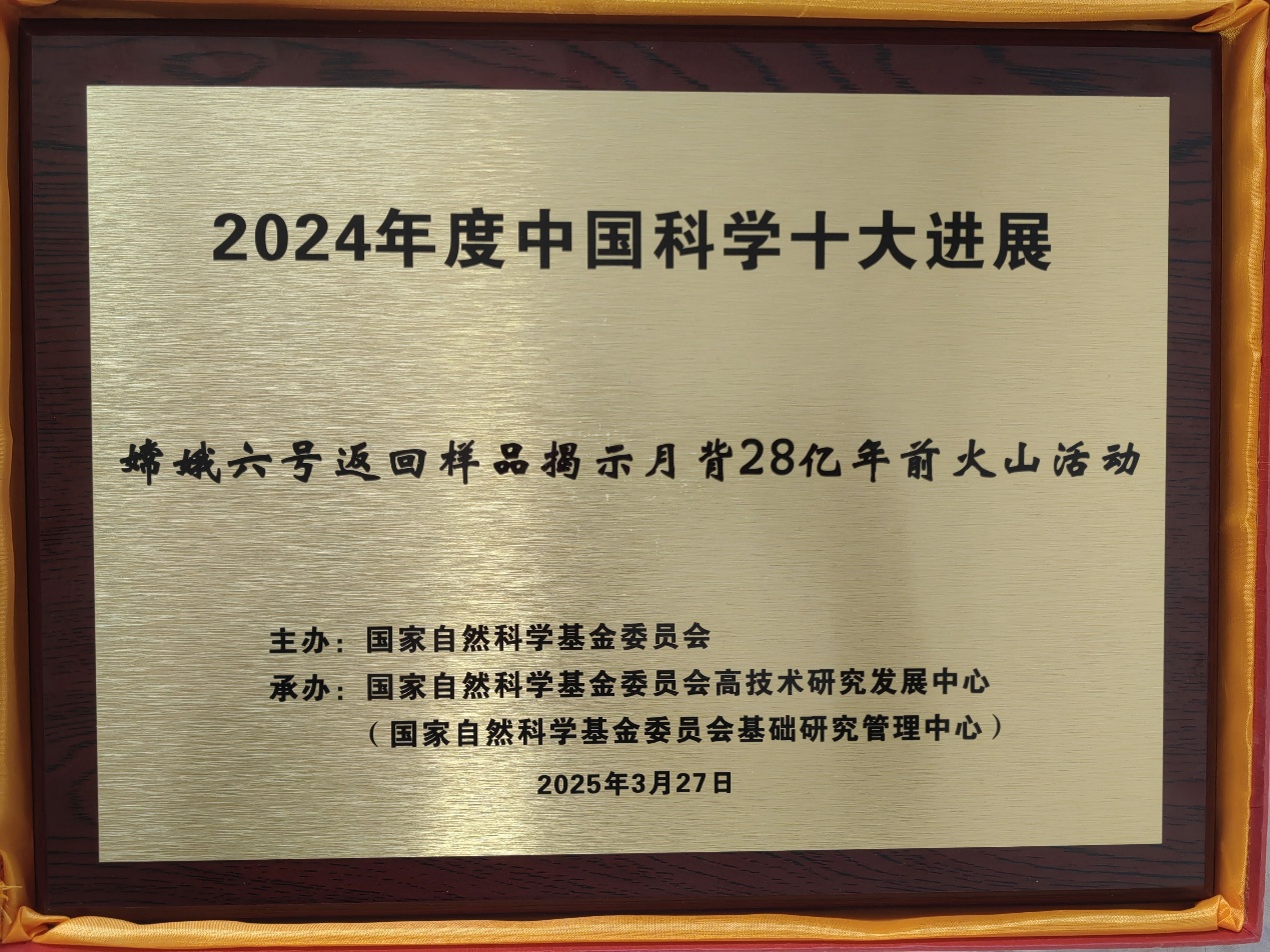 2025年3月27日,国家自然科学基金委员会在2025中关村论坛年会开幕式上正式发布了2024年度“中国科学十大进展”。我所作为第一完成单位的“嫦娥六号返回样品揭示月背28亿年前火山活动”研究成果成功入选,这是我所继“嫦娥五号月球样品揭示月球演化奥秘(2021年)”、 “祝融号巡视雷达揭秘火星乌托邦平原浅表分层结构(2022年)”之后,第三次获此殊荣。