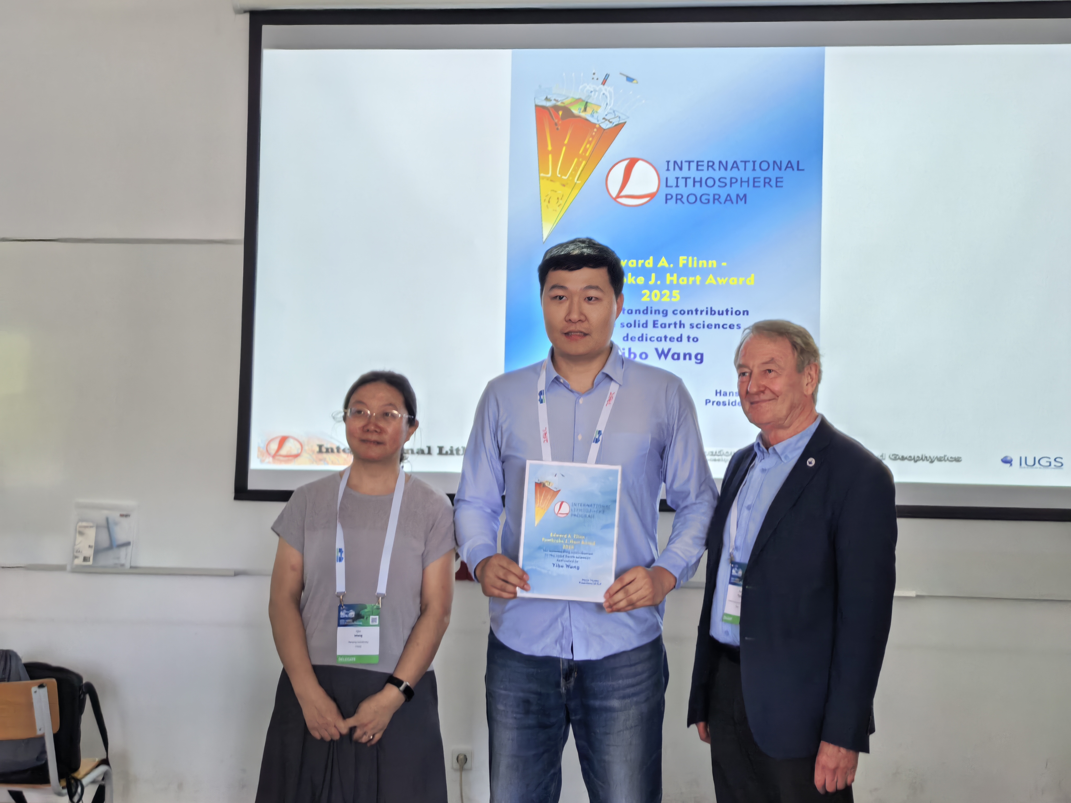 王一波(中)接受国际岩石圈计划主席Hans Thybo教授(右)颁奖,