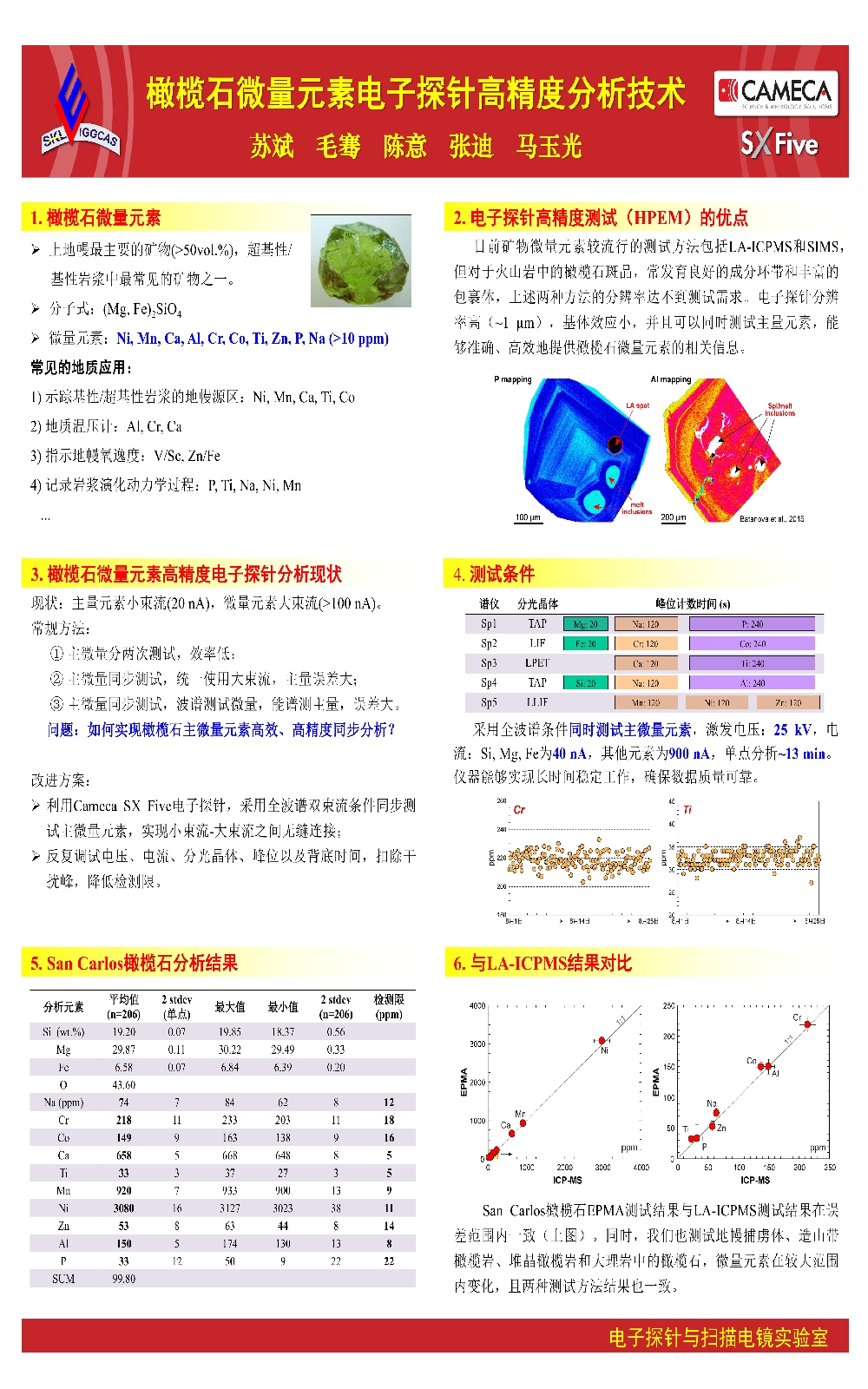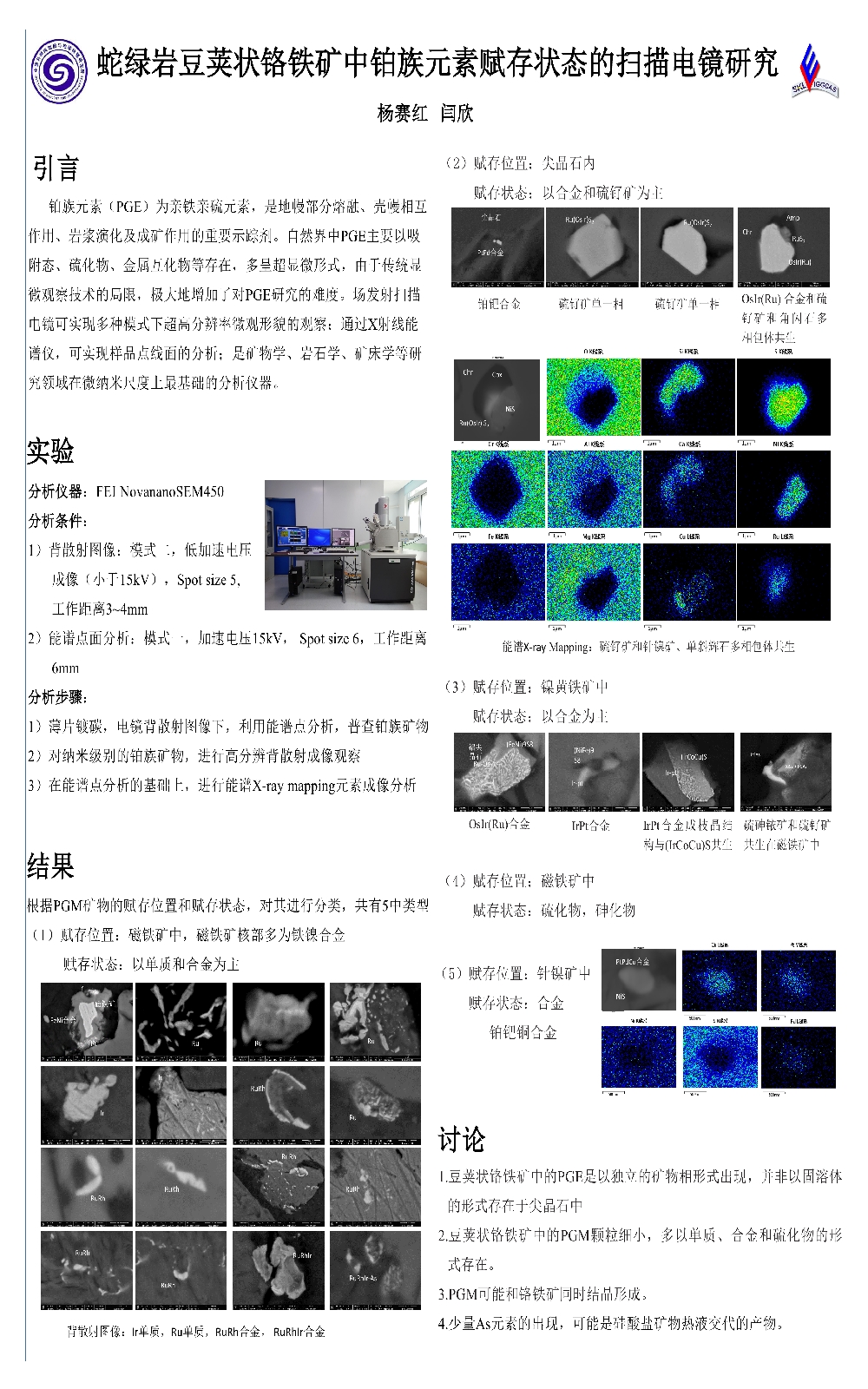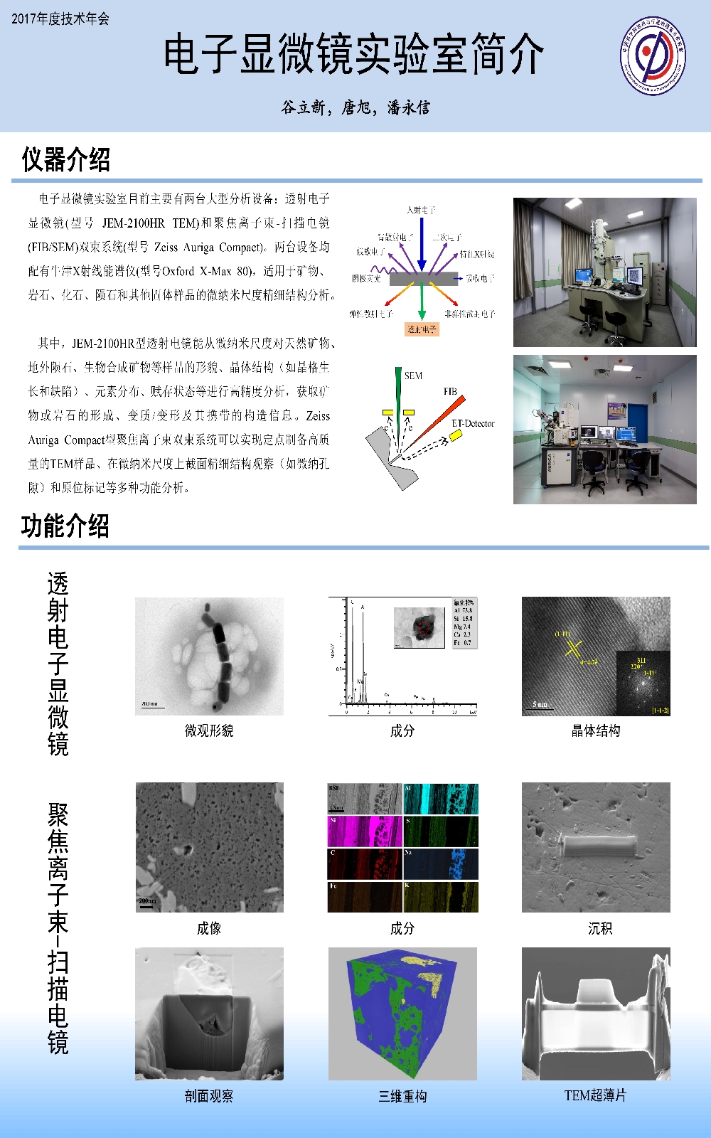 | 5-蛇绿岩豆荚状铬铁矿中铂族元素赋存状态的扫描电镜研究- 杨赛红 | 6-橄榄石微量元素电子探针高精度分析技术-苏斌 | 7-水平光路红外光谱显微系统实验平台-苏文 | 8-唐旭-矿物结构与界面的透射电子显微学研究 |