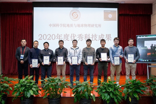 吴福元所长、张小雷书记、杨进辉副所长、朱日祥院士、王成善院士、潘永信院士、底青云副所长、段晓男处长、李颖虹副处长分别为2020年度优秀科技成果获奖人颁奖