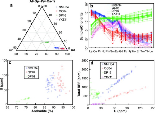 图1 (a)石榴石成分三角投图;(b)石榴石稀土元素球粒陨石标准配分图;(c)石榴石U和钙铁榴石成分相关性图;(d)石榴石U含量和稀土含量相关性图
