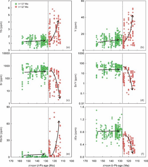 中科院广州地化所高昕宇博士和赵太平研究员系统对华北南缘中生代的岩浆作用及其与成矿的关系,近年来来开展了细致的研究工作,他们系统总结了前人研究资料,从岩浆岩的时空演变、岩石组合和地球化学特征等,探讨了花岗岩的物质来源及其形成的地球动力学机制。研究发现花岗质岩浆作用持续近50Ma,经历了2个阶段的演化,地球化学特征在127Ma前后有明显差异(图1)。早期阶段的花岗岩(158~128Ma)为I型花岗岩,以不具有明显的Eu负异常、富集大离子亲石元素和亏损Y、Yb等重稀土元素为特征。晚期花岗岩(126~112Ma),更富硅和钾,Eu负异常明显,具有更高的Y、Yb含量和Rb/Sr比值,而Sr、δEu、Sr/Y比值等明显降低,具有较强分异演化的特征,均属于A型花岗岩或高分异I型花岗岩,Sr、Nd、Hf同位素组成相对早期的更亏损(图2),并伴随少量基性岩浆岩的发育。由早到晚,幔源组分显著增多,认为华北克拉通南缘晚中生代构造体制由加厚的岩石圈向强烈伸展减薄的构造环境的转变,而127Ma前后是华北南缘晚中生代构造体制转变的一个关键时期(图3)。华北克拉通南缘晚中生代强烈的岩浆-成矿-构造热事件并不是扬子与华北克拉通碰撞后的产物,而是与古太平洋板块在亚洲大陆东部之下俯冲方向和速率的改变引发的整个中国东部构造转折、强烈壳幔作用、岩石圈伸展减薄有关。