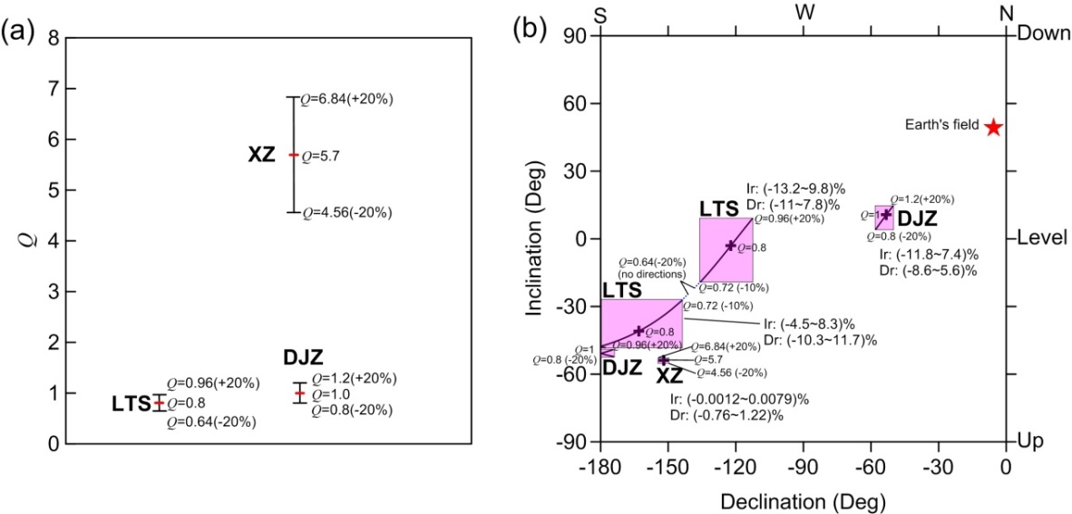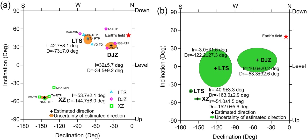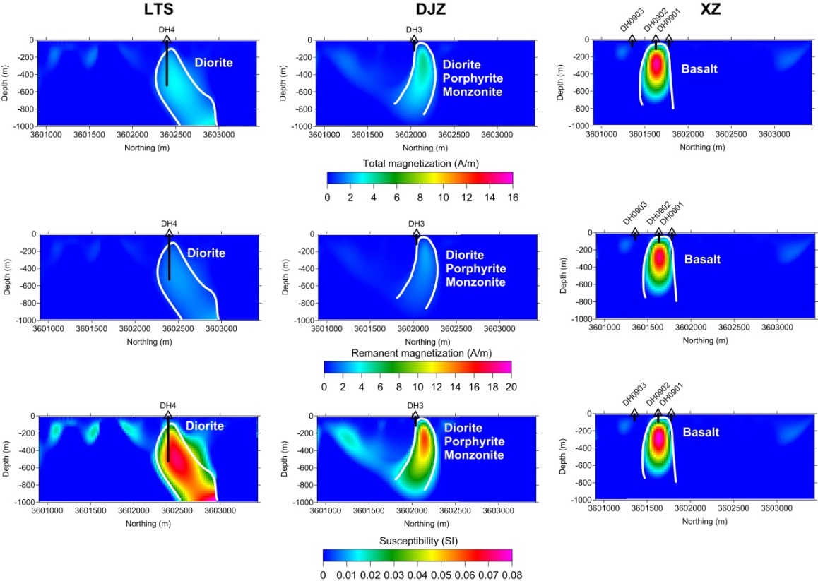 刘双等最新研究成果提出基于磁异常反演提取剩磁强度、方向及真磁化率信息方法。地磁异常是磁性场源的客观响应,因而地磁异常的幅值、极性隐藏着剩磁信息。本方法首先通过各种相关性方法估计总磁化强度方向,然后进行总磁化强度大小反演,从而获得场源的磁化强度矢量分布。基于总磁化强度、剩余磁化强度及感应磁化强度的矢量关系,将描述剩磁与感磁相对强度的柯尼斯西格尔比值作为先验信息,估算剩余磁化强度方向,并进一步计算出剩余磁化强度大小和真磁化率信息。最终,获取的剩磁方向信息为地质演化过程提供依据;获取的剩磁强度和磁化率信息,描述了磁性场源的几何特征。