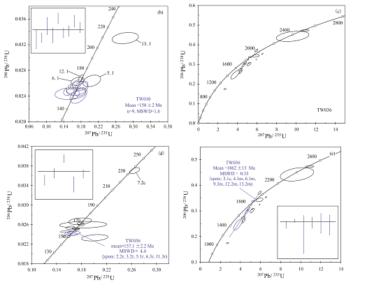 辽东半岛是华北克拉通东部地块的重要组成,中生代时期经历了由挤压造山向伸展减薄的大地构造环境转变,导致了大规模岩浆活动和金成矿作用。在辽东半岛丹东地区,广泛出露一套酸性-中酸性侵入岩体,岩性以黑云母二长花岗岩和含二云母二长花岗岩为主。该岩体成岩期后受到较强的塑性变形,局部发生碎裂岩化和糜棱岩化,且岩体内含有较多辽河群变质岩残留体,前人曾称之为古元古代混合岩,属辽吉花岗岩一部分。本文在中生代五龙岩体中发现了古元古代侵入岩残留体,为了分析二者年代学、岩浆源区特征和成因联系,进行了锆石SHRIMP U-Pb同位素定年和原位微区Lu-Hf同位素测试。结果显示:大面积的中生代侵入岩体结晶年龄为(158±2)Ma,形成于晚侏罗世;锆石原位εHf (t)值为-29.3~-22.1,二阶段Hf模式年龄tDM2为2606~3064Ma,成岩物质来自太古代上地壳岩浆源区;而古元古代侵入岩残留体锆石具典型的核-幔-边结构:锆石核部年龄范围为1851~2528Ma,εHf (t)值为-12.2~ +4.0,二阶段Hf模式年龄tDM2为2519~3437Ma,反映核部继承锆石的多源性;幔部上交点年龄为(1862±13)Ma,代表原岩结晶年龄,εHf (t)值为-11.9~ -2.2,二阶段Hf模式年龄tDM2为2644~3241Ma;新生边谐和年龄为(157.1±2.2)Ma,代表变质重结晶年龄,εHf (t)值为-30.8~ -26.1,二阶段Hf模式年龄tDM2为2852~3150Ma,均反映上地壳岩浆源区特征。研究认为,辽东半岛大面积侏罗纪五龙岩体是古元古代花岗岩受晚侏罗世~160Ma重熔作用,而原地重新结晶形成的岩体;部分未完全重熔而形成的残留体是华北克拉通东部北缘古元古代侵入岩于中生代拆沉-重熔的直接证据。