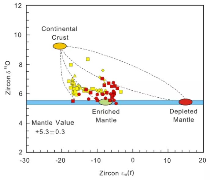 图3 NCC北东部中生代早期侵入岩中锆石εHf(t)-δ18O图解