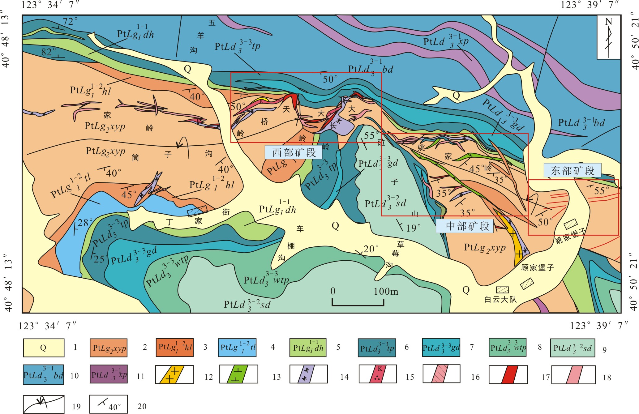 1-第四系;2-盖县组矽线石黑云片岩;3-盖县组黑云变粒岩;4-盖县组透闪变粒岩;5-盖县组大理岩和变粒岩互层;6-大石桥组透辉透闪片岩;7-大石桥组薄层硅质条带大理岩;8-大石桥组条带状透辉透闪片岩;9-大石桥组薄层含石墨大理岩;10-大石桥组白云石大理岩;11-大石桥组斜长角山片岩;12-花岗斑岩;13-闪长玢岩;14-石英斑岩;15-含金硅钾蚀变岩;16-含金石英脉;17-金矿体;18-银矿体;19-倒转向斜轴;20-片理产状