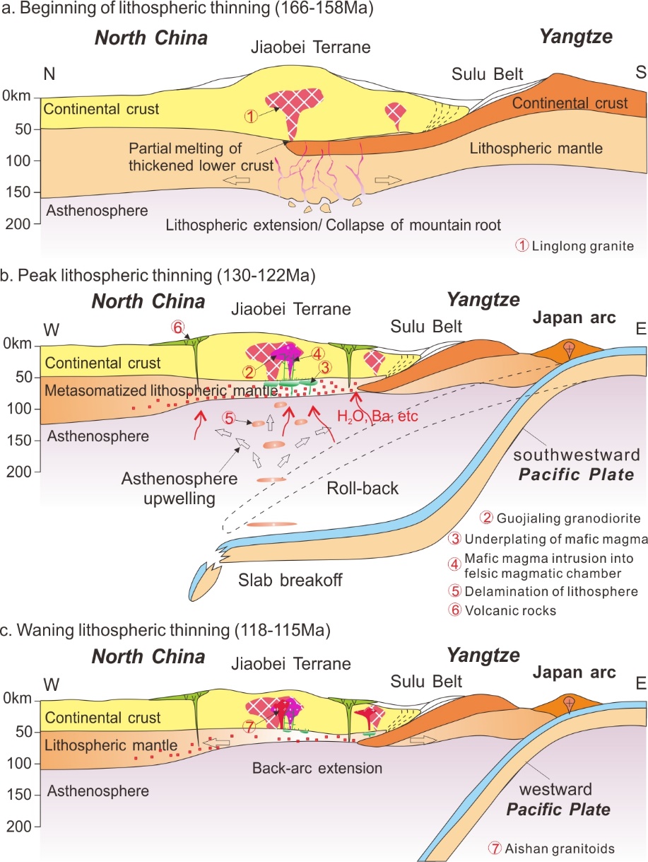 早期玲珑花岗岩(166–158 Ma)在地球化学特征上与埃达克质岩石相似,具有负的?Nd(t) (-21.3至-19.2),锆石?Hf(t) (-26.8至-18.7),和高的锆石δ18O (6.7‰至8.3‰)。岩浆来源于华北东部俯冲加厚的下地壳,并有俯冲的扬子板块物质贡献,代表了构造体制由挤压变为伸展后的产物,岩石圈减薄的初始阶段。中期郭家岭花岗闪长岩(130–128 Ma)地球化学特征为高Sr/Y比值,高Ba (898–5075 ppm)和Sr (657–2256 ppm),比玲珑花岗岩较高的?Nd(t) (-19.1至-11.5),锆石?Hf(t) (-19.0至-11.6)和δ18O (7.5‰至8.7‰),反映了流体交代岩石圈地幔来源的镁铁质岩浆与古元古代下地壳来源长英质岩浆发生混合,强烈的壳幔相互作用,与岩石圈减薄峰期时间一致,受俯冲太平洋板块的回撤影响。晚期的艾山花岗岩类(118–115 Ma)由花岗闪长岩、二长花岗岩、斑状石英正长花岗岩、碱性花岗岩和二长闪长岩组成,表现出比郭家岭花岗闪长岩略低的?Nd(t) (-17.9至-16.2)、锆石?Hf(t) (-21.4至-15.3)和δ18O (6.6‰至7.9‰)。艾山岩浆源于新太古代–古元古代地壳的部分熔融,较弱的壳幔相互作用,经历过地壳同化混染和结晶分异,代表岩石圈减薄衰弱阶段的产物。