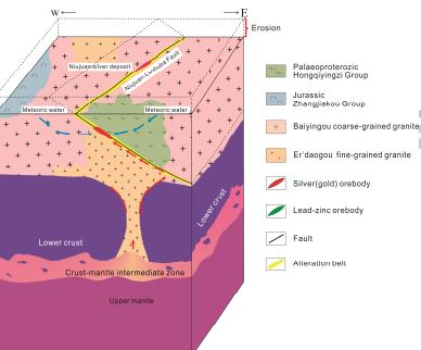 The Niujuan breccia-type silver deposit forms part of the North Hebei metallogenic belt along the northern margin of the North China Craton. The Hercynian Baiyingou coarse-grained granite and the Yanshanian Er’daogou fine-grained granite are the major Mesozoic intrusions exposed in this region. Here we investigate the salient characteristics of the mineralization and evaluate its genesis through zircon U-Pb and fluorite Sm-Nd age data, and Pb, S, O, H, He and Ar isotope data. The orebodies of the Niujuan silver deposit are hosted in breccias, which contain angular fragments of the Baiyingou and Er’daogou granitoids. The δ34S values of pyrite from the silver mineralized veins range from 2.4‰ to 5.3‰. The 206Pb/204Pb, 207Pb/204Pb and 208Pb/204Pb ratios of the sulfide minerals show ranges of 16.837-16.932, 15.420-15.501 and 37.599-37.950, respectively. The 3He/4He and 40Ar/36Ar ratios of the fluids trapped in pyrite are 0.921-4.81Ra and 299.34-303.84, respectively. The δ18O and δ18Dw values of the ore-forming fluids range from 0.6 ‰ to -4.15 ‰ and from -119.4‰ to -98.7‰, respectively. Our isotopic data suggest that the ore-forming fluids were originally derived from the subvolcanic plutons and evolved into a mixture of magmatic and meteoric water during the main hydrothermal stage. The ore-forming materials were primarily derived from the lower crust with limited incorporation of mantle materials. The emplacement time of the Er’daogou granite is constrained by LA-ICP-MS zircon U-Pb geochronology at 145.5 ±2.1 Ma. Five fluorite samples from the last hydrothermal stage yielded a Sm-Nd isochron age of 139.2 ± 3.8 Ma, indicating the upper age limit for the silver mineralization. These ages correlate with the formation of the Niujuan deposit in an extensional setting associated with the closure of the Mongol-Okhotsk Ocean and the subduction of the Paleo-Pacific oceanic plate beneath the North China Craton.