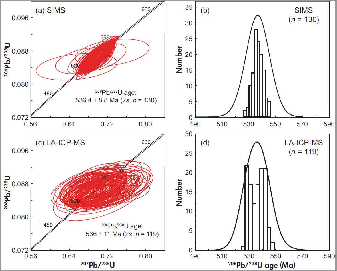 利用两家CA-ID-TIMS实验室对SA01锆石进行了U-Pb年龄分析,获得的206Pb/238U 年龄为535.08 ± 0.32 Ma (2s, n = 10, 图1)。两种原位微区分析获得的206Pb/238U年龄与TIMS在误差范围内一致。具体地,SIMS分析获得的206Pb/238U年龄为536.4 ± 8.8 Ma (2s, n = 130, 图2a, b),LA-ICP-MS分析获得的206Pb/238U年龄为536 ± 11Ma (2s, n = 119, 图2c, d)。