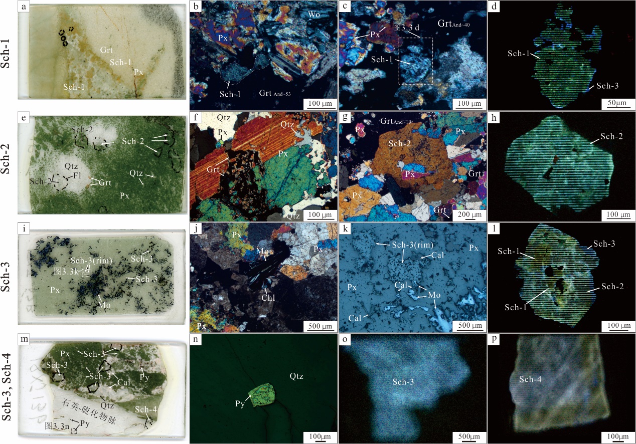 图1 邢家山W-Mo矿床矿石镜下照片及白钨矿荧光图片。b-c, f-g, j 为薄片在正交光下显微照片; k, n为薄片在反射光下显微照片; d, h, l, o-p; 为白钨矿荧光照片Px=辉石, Grt=石榴子石, Wo=硅灰石, Qtz=石英, Mo=辉钼矿. Fl=萤石, Chl =绿泥石, Cal=方解石, Sch(1-4) 代表四组白钨矿