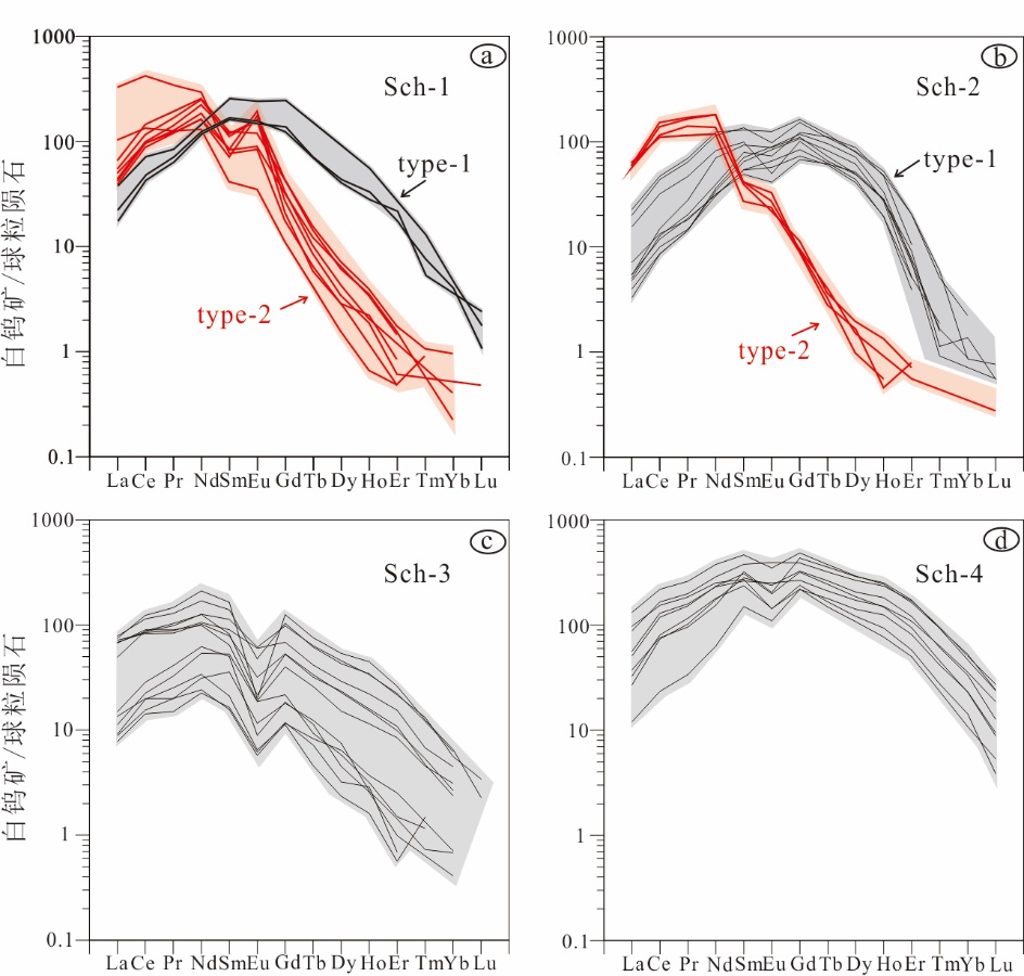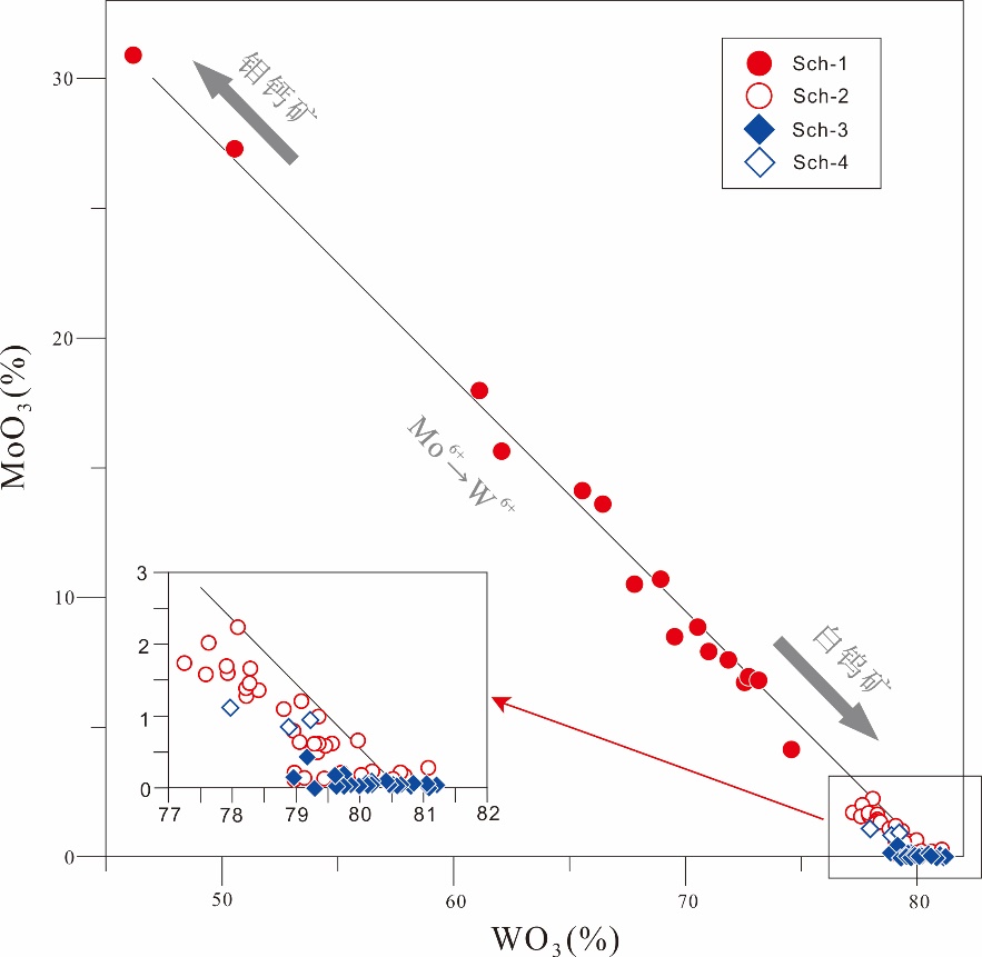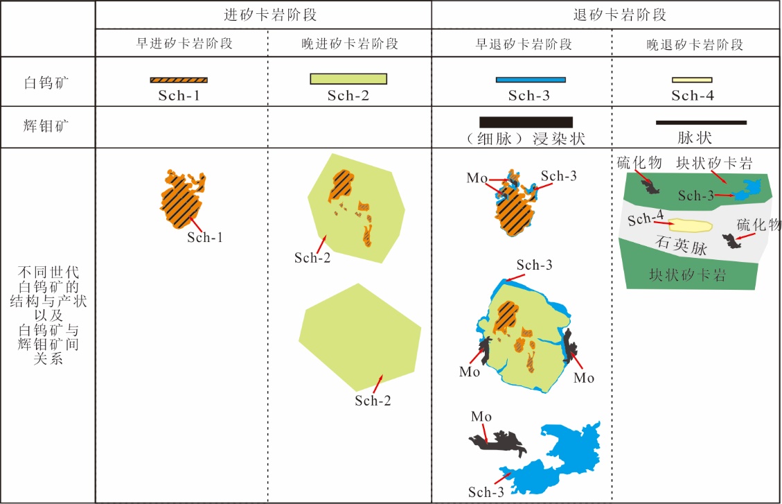 图2 邢家山W-Mo矿床不同世代白钨矿生成顺序及其与辉钼矿间关系;颜色代表白钨矿的类型,矿物生成序列线段的粗细代表矿物沉淀量。Sch=白钨矿,Mo=辉钼矿