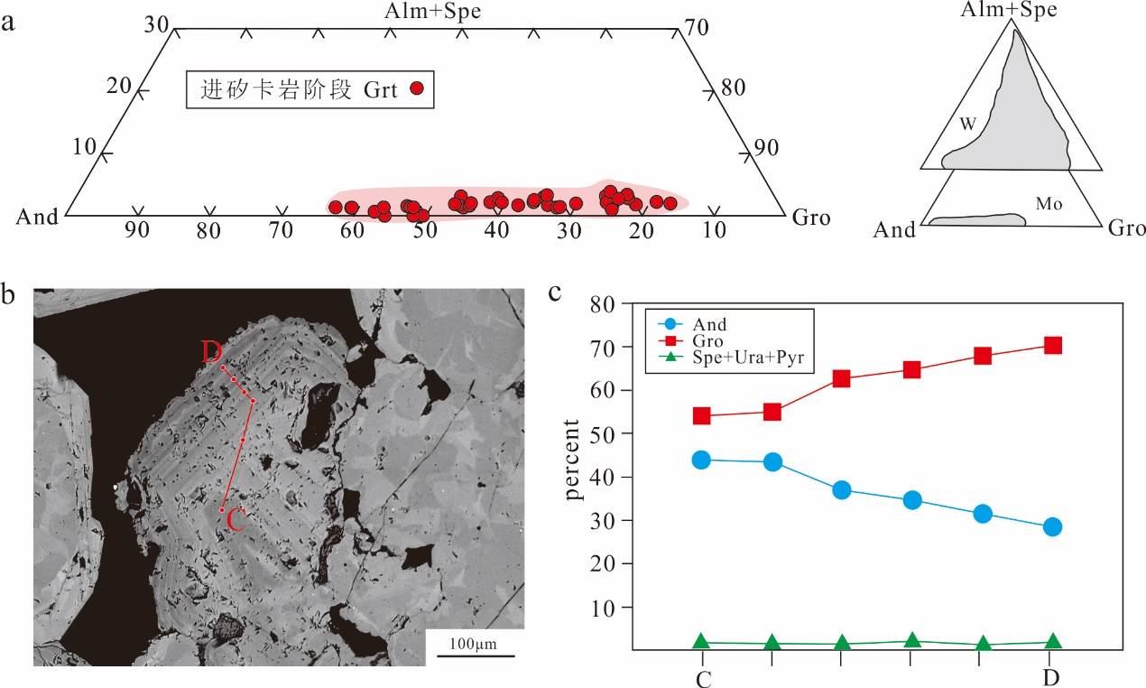 图4(a)邢家山W-Mo矿床石榴子石主量元素成分;三角图为世界主要矽卡岩型W矿床、Mo 矿床石榴子石成分分布范围(修改自Meinert, 1992);(b)邢家山W-Mo矿床中单颗粒亚自形石榴子石BSE图像及其电子探针成分分析位点;(c)图4b中从C至D成分变化图。And=钙铁榴石, Gro=钙铝榴石, Spe=锰铝榴石, Alm=铁铝榴石