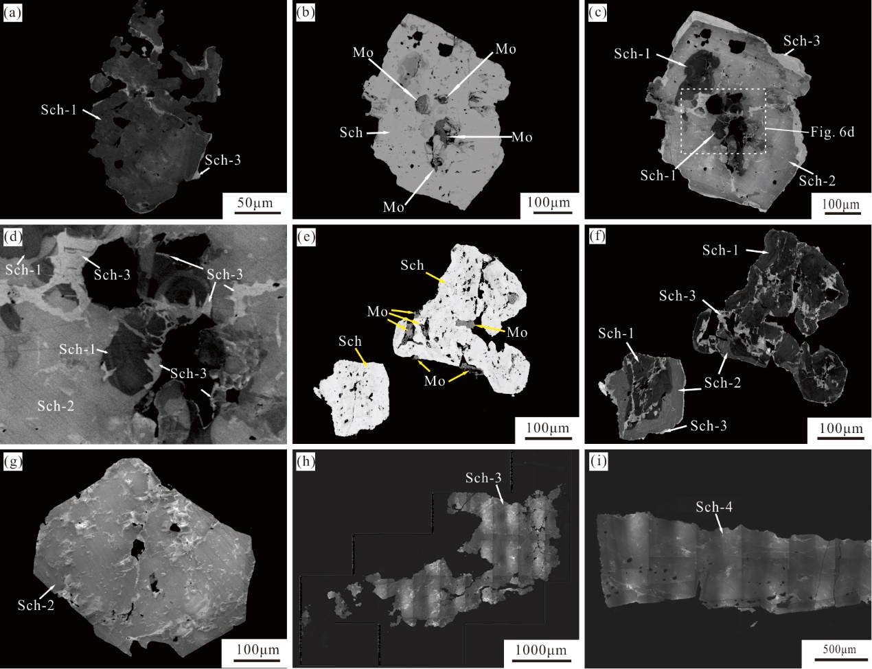 图5不同世代白钨矿CL及BSE照片。(a, c-d, f-i)为白钨矿CL 照片,(b, e)为白钨矿BSE 照片