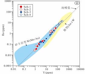 图6邢家山W-Mo矿床不同世代白钨矿Y-Ho图