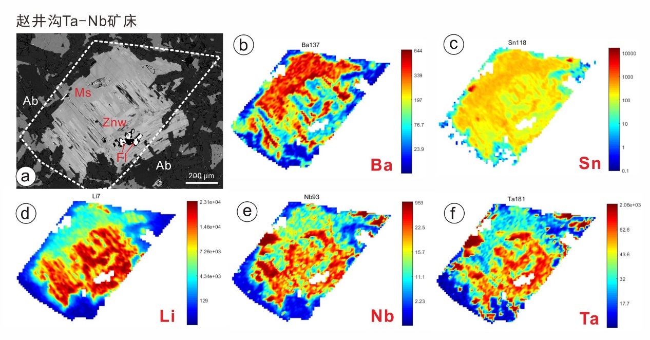 图1 (a) 花岗岩的云母在BSE图像下具有明暗不同部分,亮色为铁锂云母(Znw),暗色为白云母(Ms);(b-f) 云母Ba、Sn、Li、Nb、Ta的LA-ICP-MS面扫描分布.