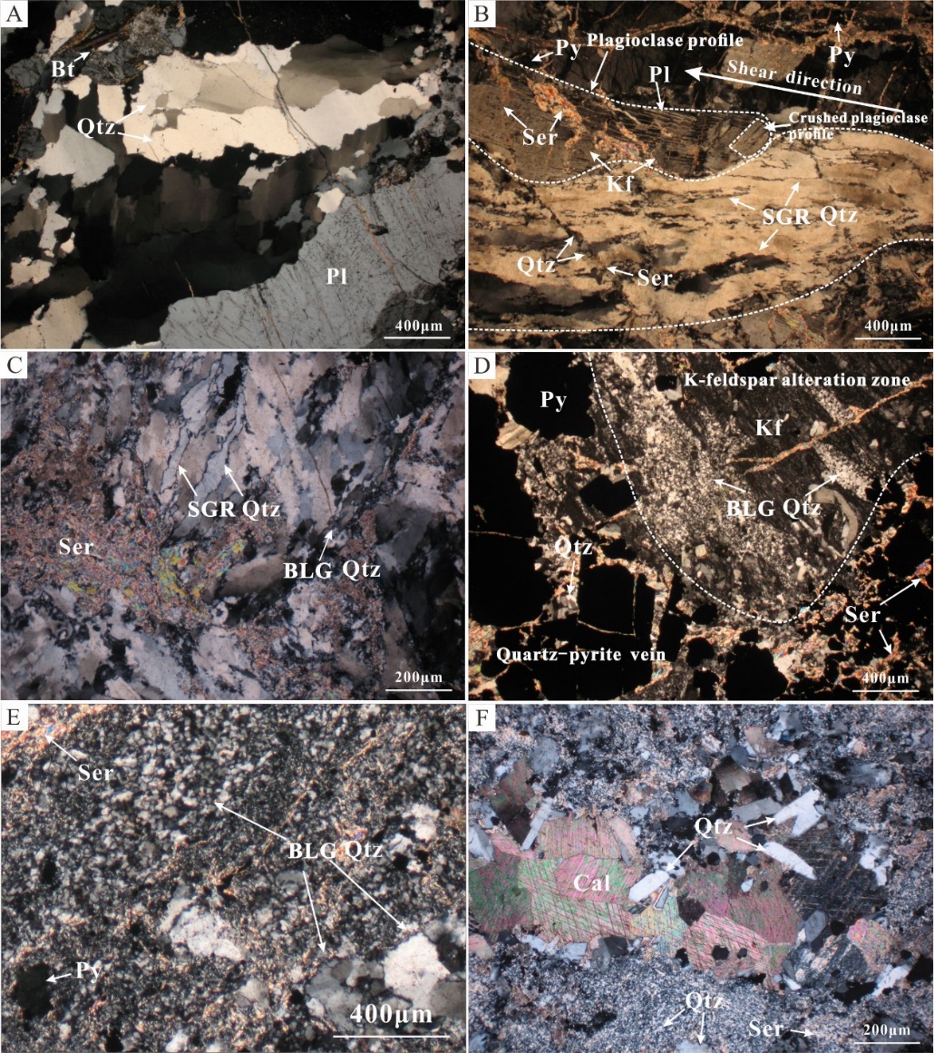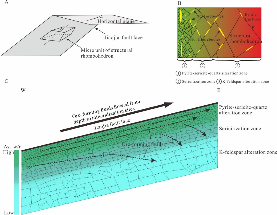 研究结果表明,焦家构造蚀变岩型金矿具有强烈的围岩蚀变特征(图1A~D),其中长石和石英的显微结构、变形特征指示,焦家断裂带从早到晚经历过四期构造变形/热液活动事件:(1)钾长石化期前韧性变形(>450℃);(2)钾长石化期脆韧性变形(380~450℃),石英发生亚颗粒旋转重结晶(SGR);(3)绢英岩化期脆韧性变形(350~420℃),石英主要经历亚颗粒旋转重结晶(SGR);(4)黄铁绢英岩化期脆性变形(300~380℃),石英发生完全膨凸重结晶(BLG)(图2A~F)。从钾长石化带、绢英岩带到黄铁绢英岩带,石英动态重结晶分形维数、经历的古应变速率以及古差应力均呈增大趋势(图3A~F、图4),导致矿化期在各蚀变带内水/岩平均比值变化、成矿流体酸性变化和矿化出现差异。控矿构造包含两类,其中缓倾类具有北西和南西两个倾向,陡倾类具有北东和南东两个倾向(图5),这些构造使得各带裂隙连通,与显微裂隙一起控制蚀变/矿化流体的运移就位过程(图6A~C)。不同蚀变带内古差应力强度、动态重结晶石英粒度和分析维数的差异是浸染状矿体和脉状矿体产出的重要控制因素。
