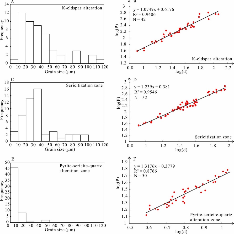 图3 焦家金矿各蚀变带动态重结晶石英颗粒粒径范围分布及其粒径-周长双对数图解,拟合的直线斜率为相应蚀变带内动态重结晶石英分形维数