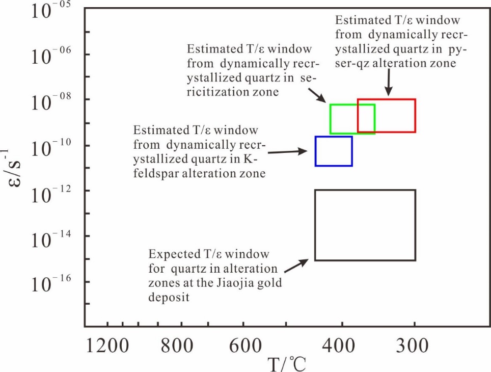 图4 焦家金矿各蚀变带内动态重结晶石英所记录的温度、应变速率范围