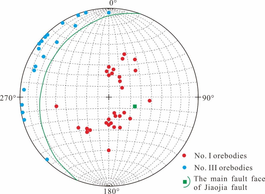 图5 焦家主断裂面、一号和三号矿体产状极射赤平投影图(图为下半球在平面上的投影)