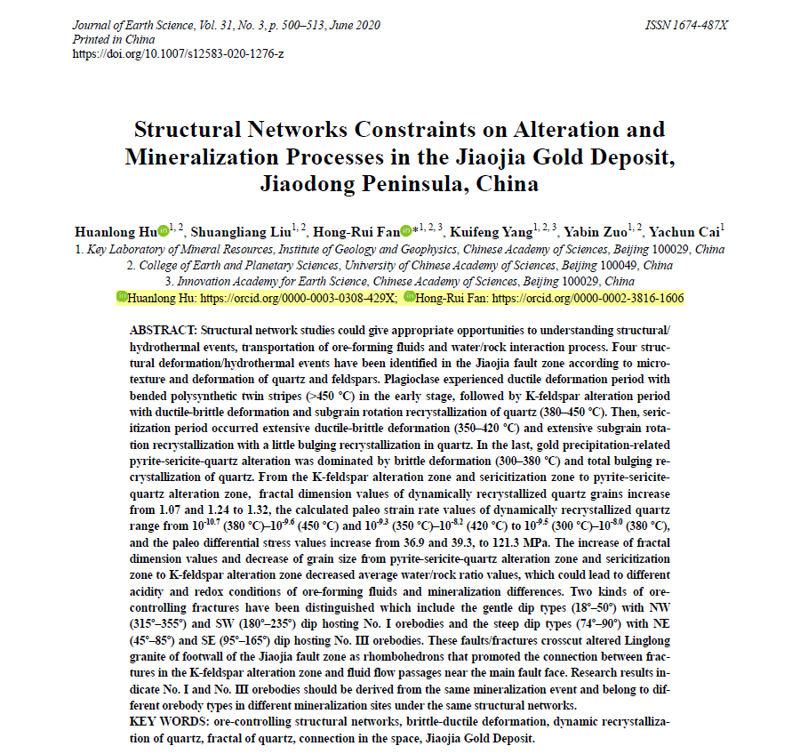 Hu Huan-Long, Liu Shuang-Liang, Fan Hong-Rui*,Yang Kui-Feng, Cai Ya-Chun. 2020. Structural Networks Constraints on Alteration and Mineralization Processes in the Jiaojia Gold Deposit, Jiaodong Peninsula, China. Journal of Earth Science, 31(3), 500-513.