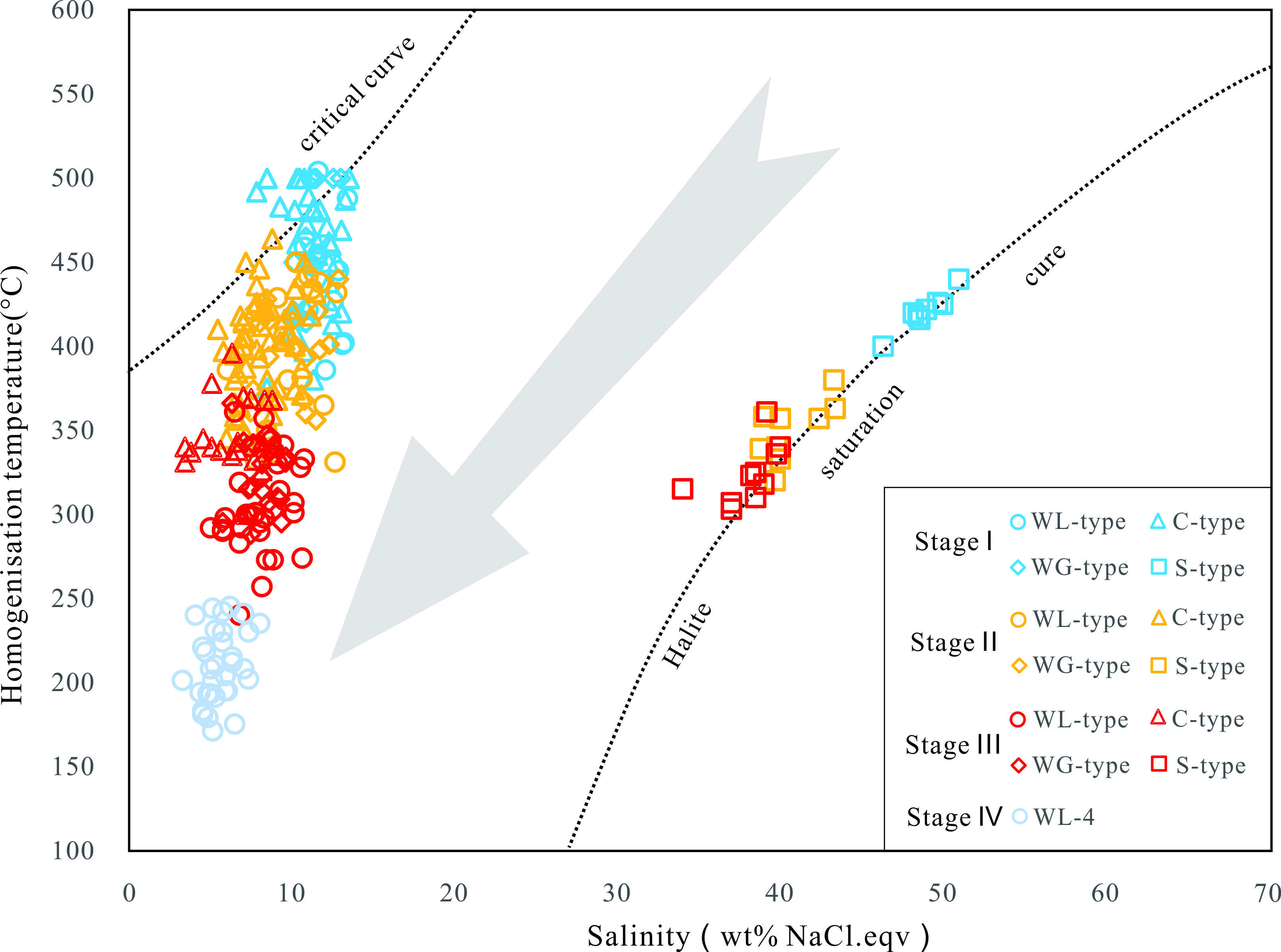 图2 夜长坪钼钨矿床不同阶段成矿流体均一温度与盐度的变化趋势