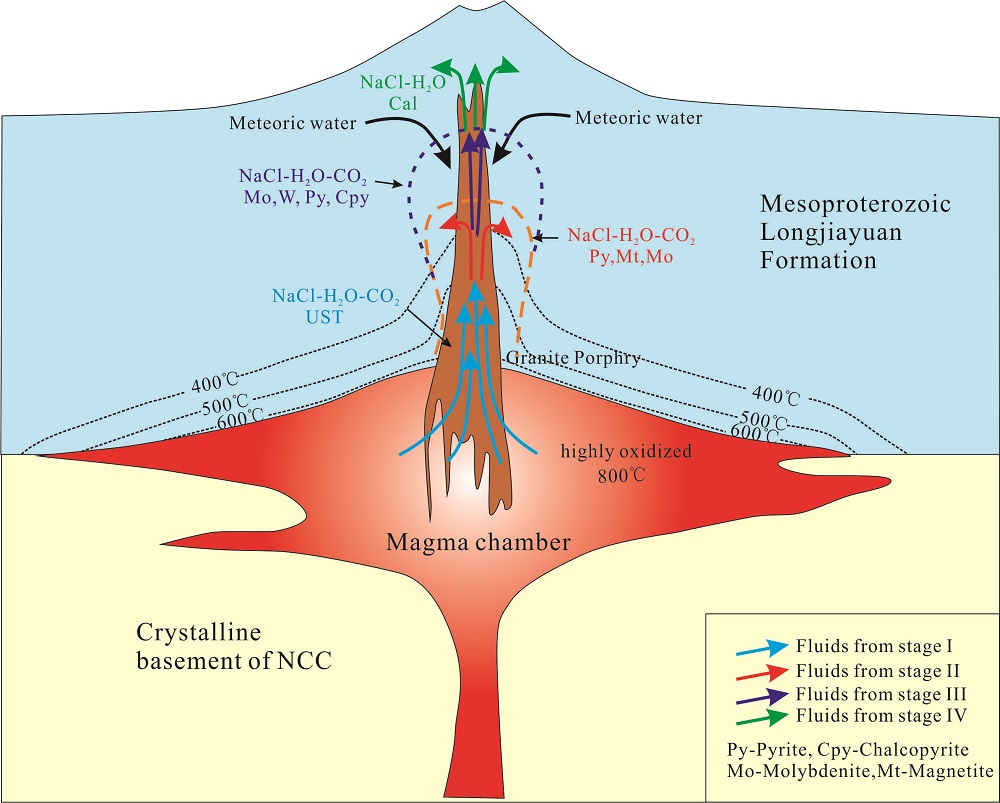 夜长坪超大型斑岩-矽卡岩型钼钨矿床位于华北克拉通南缘东秦岭钼矿带,其中钼的储量为60万吨,钨的储量达到了36万吨。尽管前人对于夜长坪钼钨矿的成岩成矿年代开展了一些相关的研究工作,但其成矿岩体的成因尚不明确。此外,尚未有关于该超大型钼钨矿床成矿流体演化过程的研究工作。