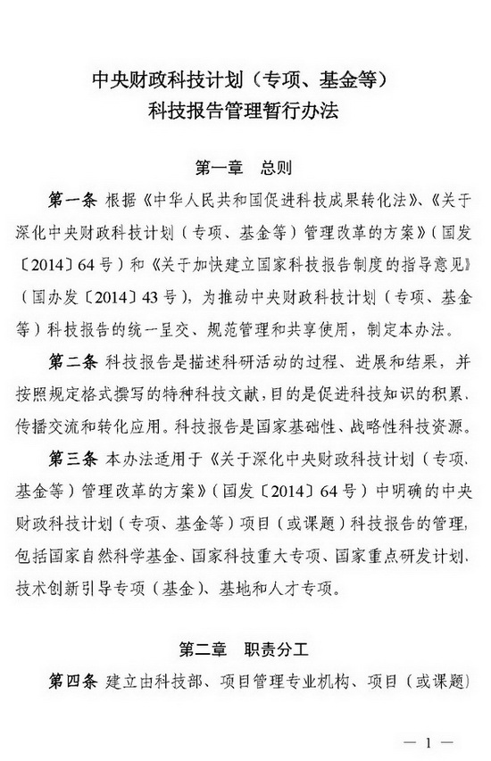 中央财政科技计划(专项、基金等)科技报告管理暂行办法