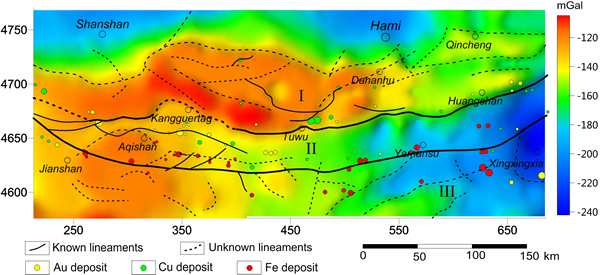 图1东天山重力异常、断裂构造及典型矿床分布