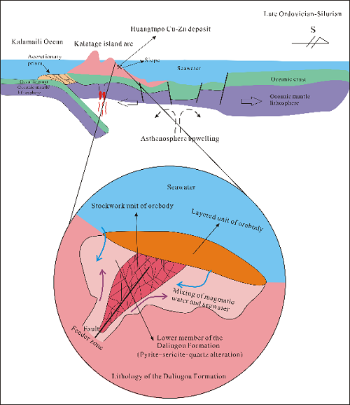 为深入了解黄土坡VMS型铜锌矿的成矿作用,以指导区域上这类矿床的勘探工作,杨成栋及其合作者在国家深地资源项目(编号为2017YFC0601201)等的资助下,在详细的野外地质调查的基础上,通过硫化物组合Rb-Sr和黄铁矿Re-Os同位素定年、流体包裹体岩相学和显微测温、H-O-S-Pb同位素示踪等方法,探讨了黄土坡VMS型铜锌矿的成矿机制,并在此基础上建立了矿床模型(图2)。
