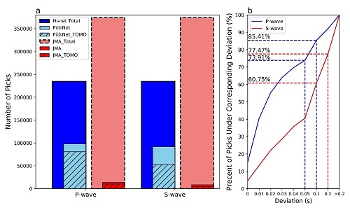 图 3. PickNet在300个日本区域地震对应的Hi-net台网波形记录上的拾取结果与JMA提供的人工拾取震相对比。(a),潜在震相数目(即地震数目乘以台站数目)、PickNet自动拾取数目、JMA人工拾取数目的对比。当波形中的初至难以拾取时,PickNet输出会全部为零,即此时对该波形记录做拒识处理,这对保证所拾取震相的质量十分重要;(b)同时被PickNet和人类专家拾取的震相的到时偏差对比。
