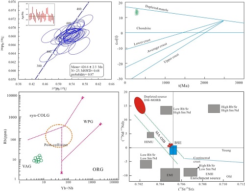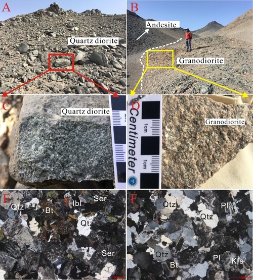 成曦晖及其合作者在国家深地资源项目(编号为2017YFC0601201)等资助下,针对红石铜矿南西方向4km处出露的花岗闪长岩(坐标位置N 42°37′53″, E 91°55′17″) 开展了岩体地质、岩相学, 锆石LA-ICP-MS U-Pb、锆石Lu-Hf 同位素、岩石主、微量和Sr-Nd同位素测试,探讨岩石成因及地球动力学背景。主要取得以下新的认识:
