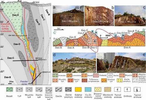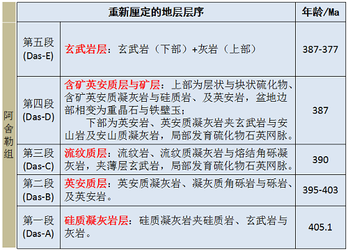1. 阿舍勒组地层分为5个岩性层(图1),从下往上依次为:硅质凝灰岩层(Das-A; 405.1 ± 1.8 Ma)、英安质层(Das-B;395.9–403 Ma)、流纹质层(Das-C;390.9 ± 0.83 Ma)、矿层(Das-D;ca. 387 Ma)、及玄武岩层(Das-E;387–377 Ma)。阿舍勒组与其上覆齐也组D3q1间为不整合接触关系。