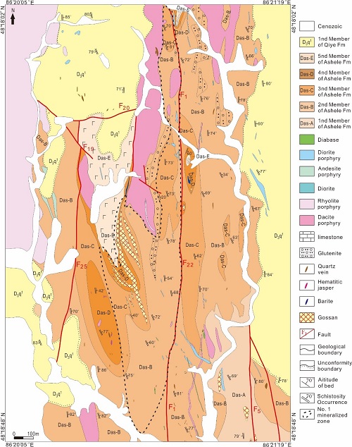 阿舍勒铜锌矿床是阿尔泰成矿带重要的VMS矿床之一,它是研究阿尔泰块状硫化物矿床成矿机制与成矿规律的天然实验室。然而,关于其矿床构造问题还未形成统一认识,仍需开展细致的研究,早期研究一直存在着矿体形态(如:单斜、弯月形、“Y”字形、板状、倒转紧闭向斜等)、地层层序等方面的争议。这些争议直接影响了矿床构造的厘定、成矿机制的研究及找矿方向的确定。