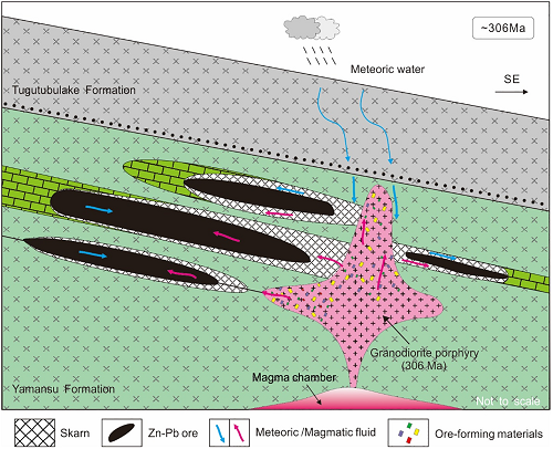 为深入理解天山地区远矽卡岩型铅锌矿床的成矿机制,中国地质大学(北京)薛春纪教授课题组以东天山阿奇山矽卡岩型铅锌矿床为研究对象,在国家深地资源项目(编号为2017YFC0601202)等资助下,基于详细的野外地质调查,开展了成矿期黄铁矿Re-Os定年、矿区与成矿相关的花岗闪长斑岩LA-ICP-MS锆石U-Pb定年以及Hf同位素研究工作,结合硫化物及围岩、岩体的S-Pb同位素研究,认为阿奇山矿床为远矽卡岩铅锌矿床,矿床形成于306 Ma,成矿物质和成矿流体主要为岩浆来源,矿床的矽卡岩化和矿化是岩浆热液沿地层接触界面、层间裂隙等构造薄弱带对富钙质火山碎屑岩和碳酸盐岩进行远源渗滤交代作用的结果(图1)。研究强调晚古生代增生岛弧环境是天山斑岩-矽卡岩型成矿作用的重要控制因素。