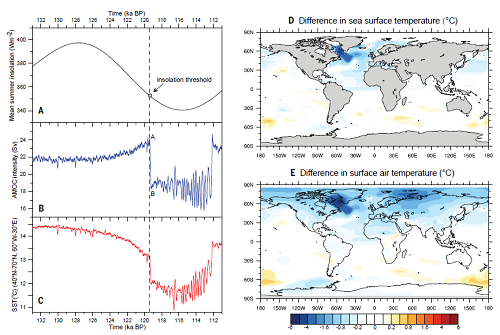 尹秋珍等的模拟结果显示,间冰期末期AMOC的突然减弱受控于北半球高纬度夏季太阳辐射,而温室气体只起到轻微调控太阳辐射的作用。随着太阳辐射的逐渐降低,北极海冰范围逐渐扩张。当太阳辐射降低到一个临界值时,海冰开始覆盖拉布拉多海的对流中心,导致其对流突然关闭,引起AMOC的突然减弱。同时在北欧海北部,海冰与海洋内部温度的相互作用使得那里的对流产生了百年尺度的高振幅振荡,从而引起了AMOC的大幅度振荡。只有当太阳辐射重新升高到一定程度,使得拉布拉多海和北欧海北部不再被海冰覆盖,这种AMOC的大幅振荡才会停止。
