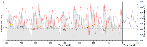 由于不同间冰期太阳辐射的纬度和季节性分布不同,太阳辐射的临界值在不同间冰期也会略有不同,但都足够低,且变化范围较小,在352.1 W/m2 (MIS-15e)358.2 W/m2 (MIS-7a)之间(图2)。北半球夏季平均太阳辐射的变化同时受控于岁差和斜率,其中岁差的影响更为显著。尹秋珍等的研究表明,太阳辐射临界值的出现需要较大的岁差(北半球夏季在远日点且偏心率较大)以及较小的斜率。他们的研究显示,在过去80万年,这种太阳辐射临界值不仅出现在间冰期,也出现在很多冰期(图2)。但是由于冰期非常不同的气候条件(较大冰盖、较低温室气体等),冰期的太阳辐射临界值很有可能有别于间冰期的临界值。同时,他们的研究还显示,与过去80万年的间冰期相比,我们目前所处的间冰期非常特别,在很长的一段时间内太阳辐射都太高,不足以达到临界值,临界值只出现在5万年后(图2),与Berger and Loutre (2002)通过冰盖模拟得出我们目前所处的间冰期超长、下一个冰期在5万年后才可能出现的结论是一致的。