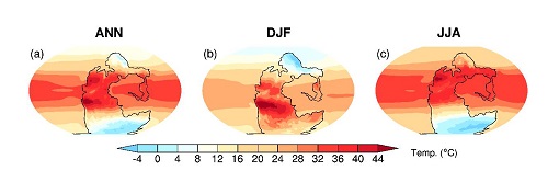 北京大学胡永云团队在Science Bulletin第10期发表题名为“The Hadley circulation in the Pangea era”的论文,揭示了2.5亿年前潘吉亚超大陆时期的哈德雷环流的特征,阐述了大陆和气候演化对大气环流的重要影响。 哈德雷环流是最重要的全球大气环流系统之一,其上升支对应着热带辐合带和热带雨带,下沉支对应着两个半球副热带干旱区。观测和气候模拟表明,随着温室气体浓度增加,全球变暖将导致哈德雷环流强度减弱、下沉支向中纬度扩张,从而导致热带辐合带降水减弱、副热带干旱区向中纬度扩张。 在约2.5亿年前,全球大陆汇聚成自南极延伸至北极的超级大陆,也就是潘吉亚超大陆,大陆面积约占地球表面积的35%,大于现代的30%。潘吉亚超大陆时期是地球历史的一个独特阶段,那时,地球处于温室气候,全球平均地面温度约为26°C,远高于现代的15°C,陆地最高温度高达50°C(图1)。在这种超级大陆和极端高温的影响下,哈德雷环流与现代的有何不同?这是胡永云团队研究的核心问题。