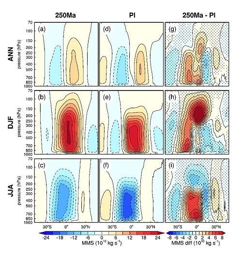 图2 模拟的潘吉亚超大陆时期的哈德雷环流(质量流函数)及其与现代哈德雷环流的对比。上排:年平均,中排:北半球冬季,下排:南半球冬季。自左至右:2.5亿年前、现代、2.5亿年前与现代的哈德雷环流之差。 潘吉亚超大陆时期哈德雷环流的一个最为显著的特征是,北半球和南半球冬季的哈德雷环流上升支分别位于23°S和18°N,与现代的上升支相比均远离赤道,这一现象是由于潘吉亚超大陆时期副热带陆地面积较大以及副热带陆地表面极高的温度造成的,潘吉亚时期的超级季风环流也对哈德雷环流上升支位置偏离赤道有重要贡献。 该项研究是在国家自然科学基金委基础科学中心项目“大陆演化与季风系统演变”(41888101)资助下完成的。 |