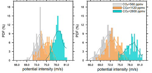 3.三类不同CO2浓度下台风潜在强度的概率密度分布(右:北特提斯洋;左:南特提斯洋)。这里的台风强度是理论推算的,台风实际风速要弱一些。