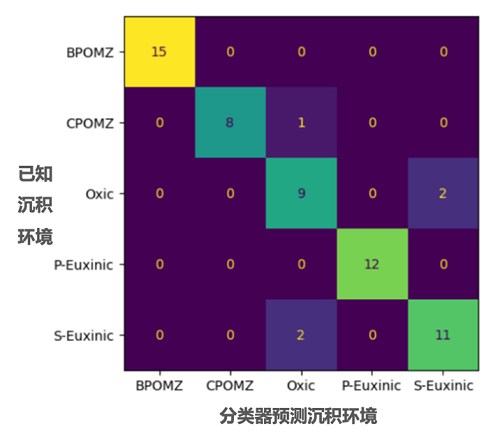 图1 页岩沉积环境示意图。图中灰色粗线代表细粒碎屑沉积物的大致位置。 基于现代海洋沉积环境(图 1)细粒碎屑沉积物的氧化还原敏感元素浓度特征及其已知的氧化还原状态,可创建能识别沉积环境的机器学习模型(分类器)。本项研究测试了6万多种元素组合和两种分类器(随机森林和K邻近算法),发现两种分类器均能利用Fe-U-V有效地区分5种主要的沉积环境(随机森林分类器的分类准确度见表1、图 2):长期缺氧带下方(本文用“缺氧带”代指“海洋最小氧带”)(Below Perennial Oxygen-Minimum Zone,下文称BPOMZ);长期缺氧带中心(Core of Perennial Oxygen-Minimum Zone,下文称CPOMZ);氧化环境(Normal Oxic Marine Settings,下文称Oxic);长期硫化盆地(Perennially Euxinic Basin,下文称P-Euxinic:); 间歇性硫化盆地(Seasonally Euxinic Basin,下文称 S-Euxinic)。将基于现代沉积环境的分类器运用到深时样品虽然会带来一定的不确定性,但总体是合理的(详细论证过程请参考文末的论文链接)。 表1 随机森林机器学习分类器区分现代沉积环境的准确度。N:现代细粒碎屑沉积物样品个数;TPR:真阳率;FPR:假阳率;mean:20次蒙特卡洛模拟结果平均值;SEM:20次蒙特卡洛模拟结果的标准误差(Standard Error of the Mean)。