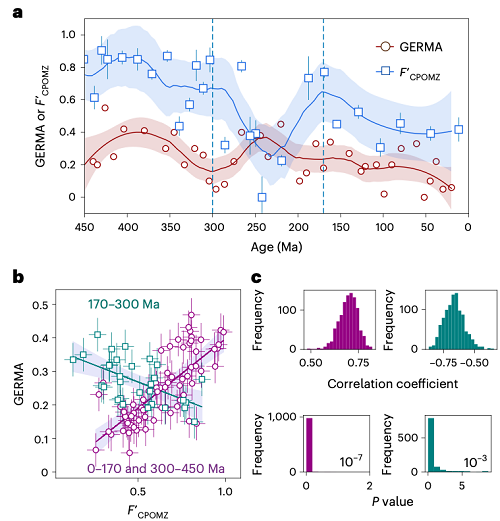 图6 属级海洋动物背景灭绝率(GERMA;不包括大灭绝事件的灭绝率)与深部陆架区的缺氧程度的相关性分析。图b中的数据来自对图a中的LOWESS区间的随机采样;图c中的柱状图表示1000次随机采样获得的Pearson相关系数和P值分布。 本研究受国家自然科学基金(41888101, 42293293, 41921002, 41821001, 41825019, 42130208)、国家重点研发计划(2022YFF0800100,2020YFA0607700)和111项目(BP0820004)的资助。 论文信息(*为通讯作者): Xiangli Wang*, Thomas J. Algeo, Chao Li*, Maoyan Zhu. 2023. Spatial pattern of marine oxygenation set by tectonic and ecological drivers over the Phanerozoic. Nature Geoscience. https://doi.org/10.1038/s41561-023-01296-y |